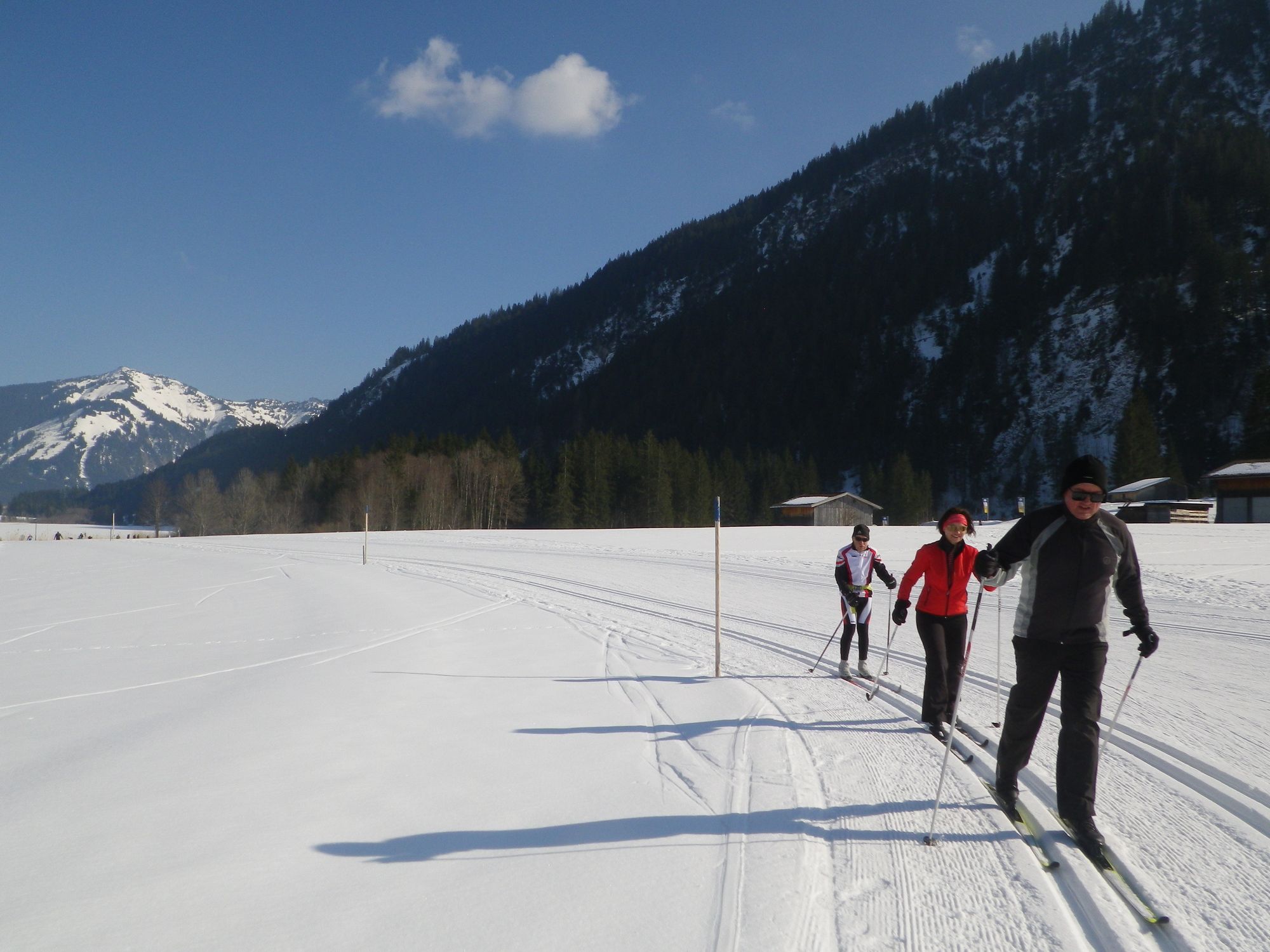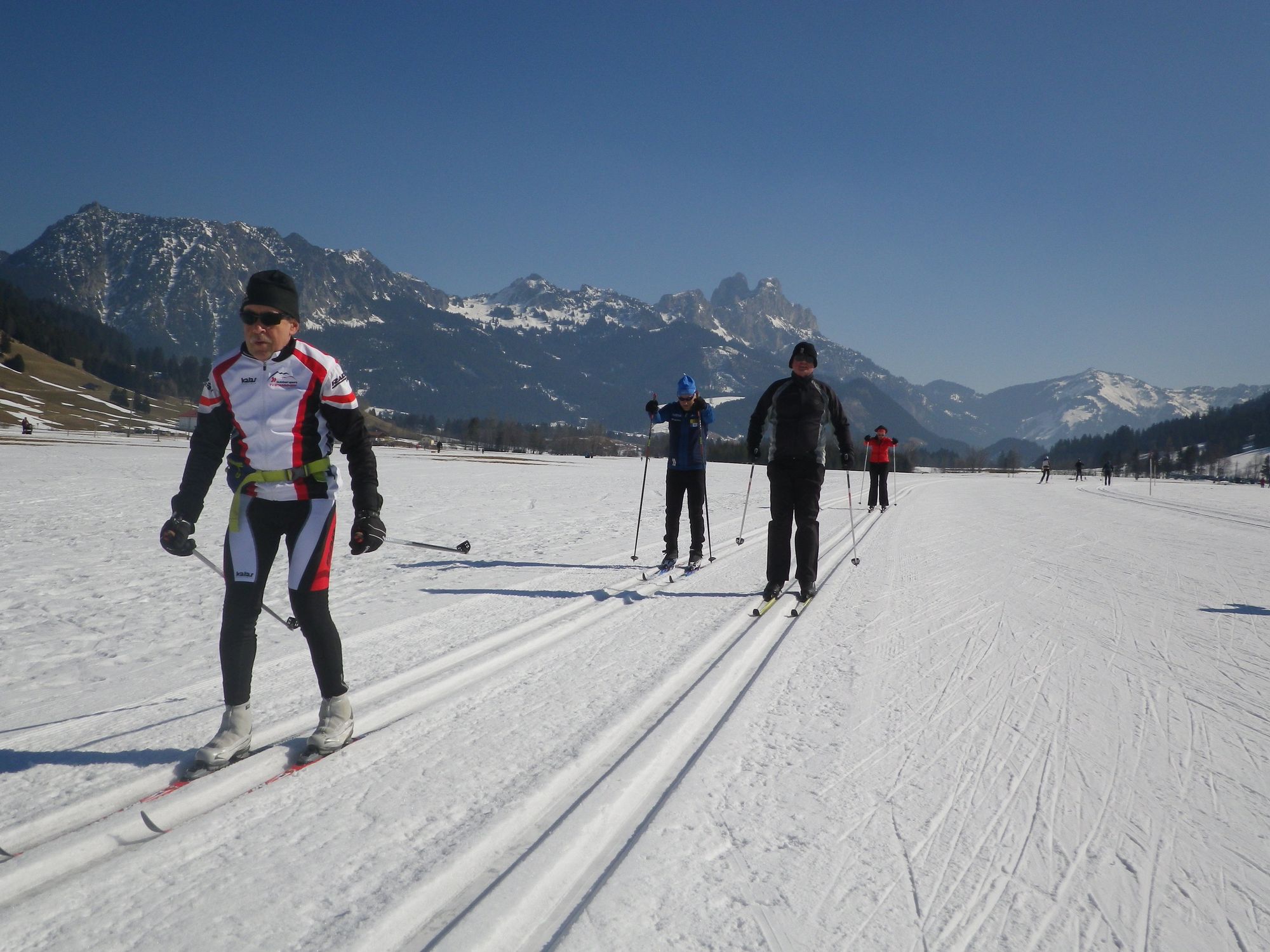 Teilweise wurde dann auf Skating-Ski gewechselt. Auch diese Technik unterrichtete Joachim. Die „Klassiker“ wurden jedoch nicht vergessen. Gemeinsam liefen wir in einer größeren Schleife bis zum Haldensee und zurück. Die Gruppe harmonierte sehr gut, auch ein sehbehinderter Teilnehmer wurde gut integriert, konnte einem Führungsläufer folgen und erhielt stets Informationen zum Verlauf und Zustand der Spur.