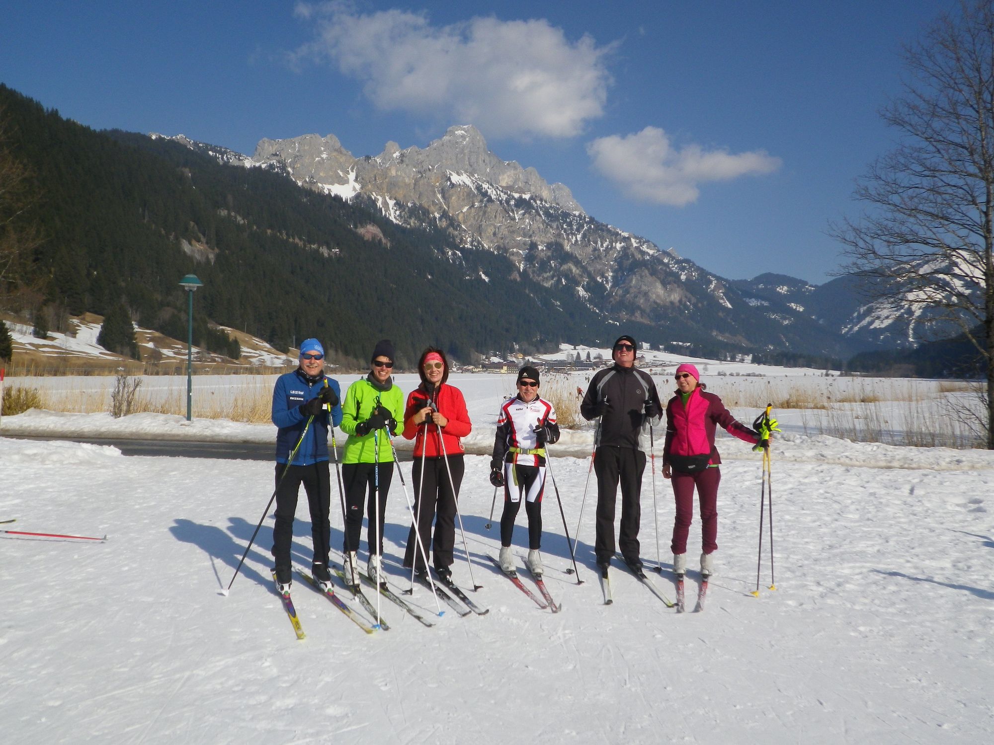 Dort erwartete uns Kaiserwetter. Obwohl recht wenig Schnee lag, waren die Loipen für den Klassischen Stil und Skating breit angelegt und top-präpariert. Nach einem Langlauf-spezifischem Aufwärmprogramm begann der Tag mit Klassik-Training direkt am Parkplatz: Gleichgewichts-, Abstoß- und Gleitübungen ohne Stöcke, zum Teil mit nur einem Ski – zum Teil mit beiden. Nachdem sich jeder ans Gerät gewöhnt hatte, wurden die Stöcke hinzugenommen und die diversen Lauftechniken vermittelt. Joachim hatte ein gutes Auge für alle und gab individuelle Tipps. Kurz vor der Mittagspause wurde dann „Strecke“ gelaufen, bis uns der Hunger in den „Ritter“ trieb, in dem uns leckere Tiroler Spezialitäten für die zweite Tageshälfte stärkten.