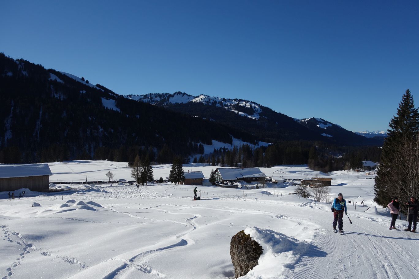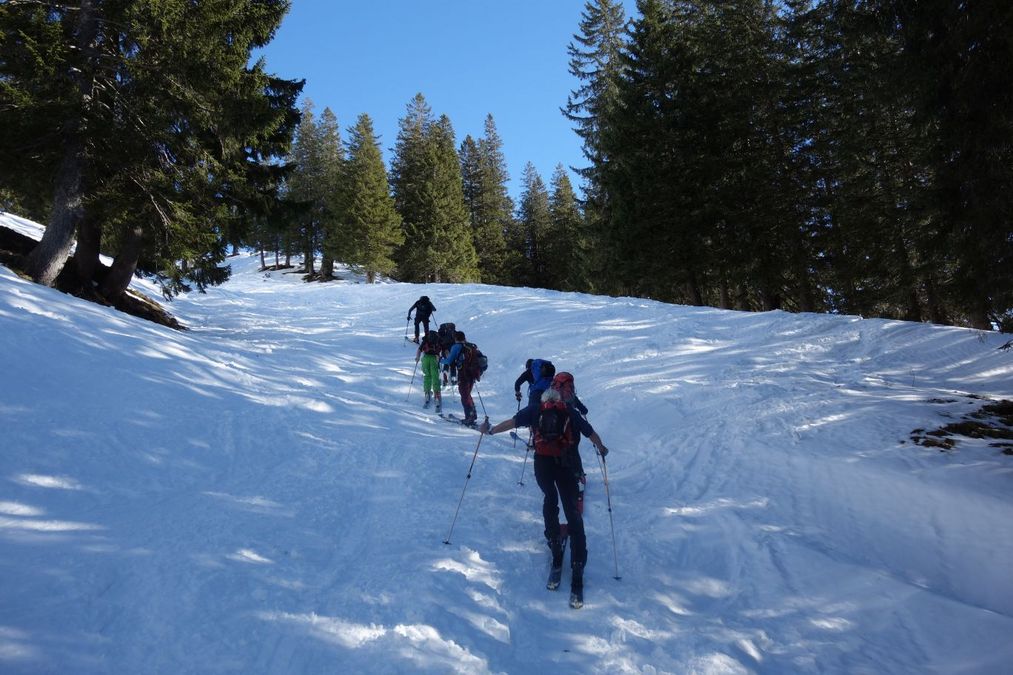 Samstagmorgen, 5.45 Uhr und vier Stammheimer Schneesportler/innen machten sich auf den Weg in das Herz des Naturparks Nagelfluhkette nach Balderschwang. Bereits schon bei der Anfahrt über den Riedbergpass lockte das herrlich leuchtende Nagelfluhgestein in die zweitkleinste Gemeinde Bayerns, mit dem am höchsten gelegenen Ortskern innerhalb Deutschlands (1.044m) – Balderschwang. Eine Tour von unserem Tourguide Thomas ausgesucht, optimal auch für Anfänger, die das Ski- und Spiltboardtourengehen einmal ausprobieren möchten. So stand an erster Stelle das sichere Aufsteigen und Abfahren im Gelände – alles coronakonform.