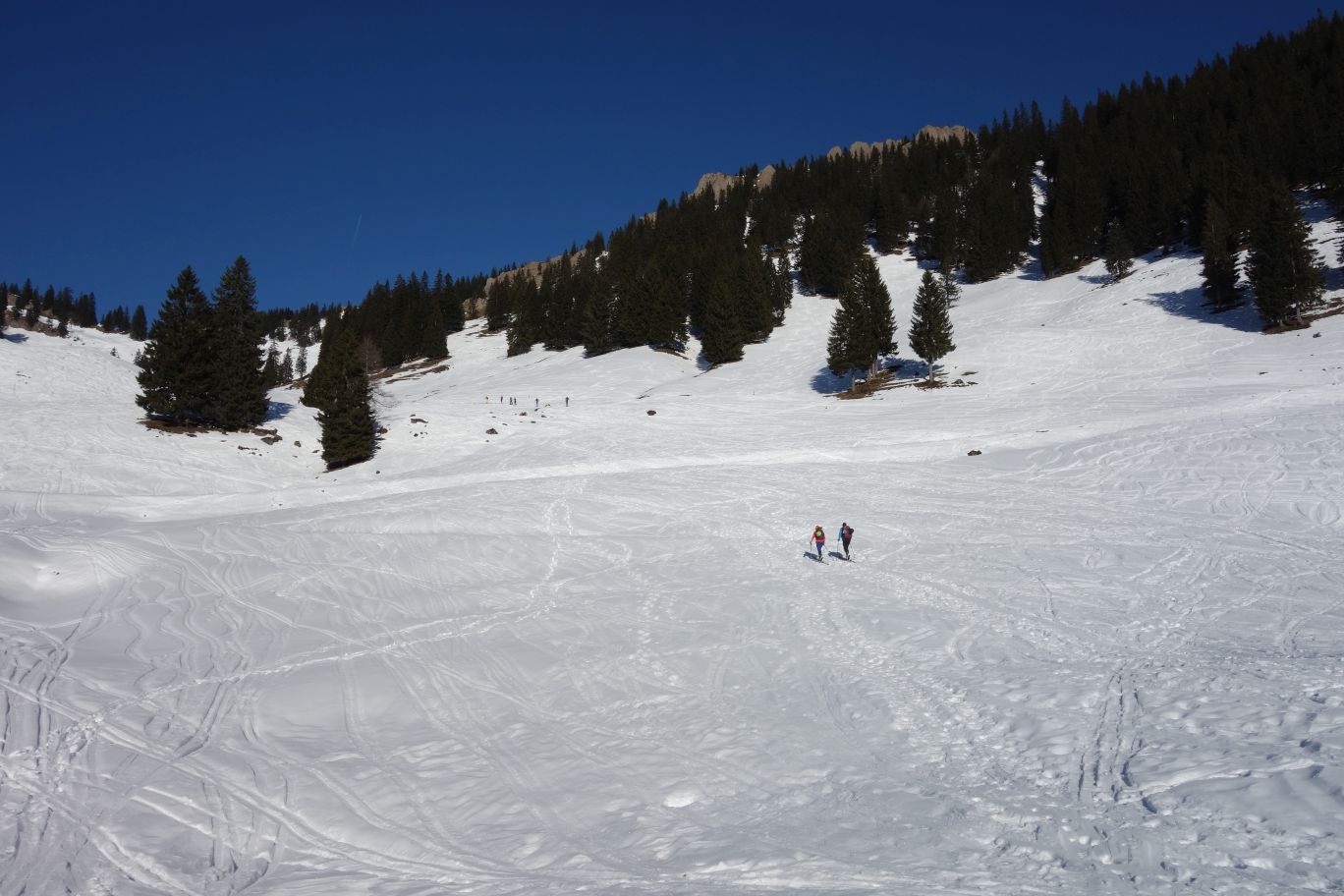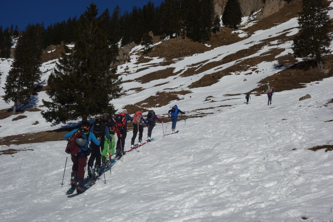 In den Fokus der Gruppe rückte vor Ort dann die Vorbereitung auf die leichte bis mittelschwere Tour auf den Siplinger Kopf (1.746m) in den Allgäuer Alpen - ca. 700 Höhenmeter Aufstieg. Es folgte ein abwechslungsreicher Aufstieg vorbei an Häusern über meist freie, mäßig steile Südhänge, der die Gruppe - zu der sich auch noch Sportler/innen des SV Winnenenden gesellten - über die Untere Socheralpe und die Alpe Oberbalderschwang bergwärts führte. Nach ca. 550m Aufstieg folgten weitere 150 Höhenmeter über eine flach ansteigende Rampe, die dann verlassen wurde und der Aufstieg sein Ende in einer langgezogenen, von Felswänden begrenzten Mulde ostwärts hinauf zum sonnenverwöhnten Gipfel fand. Ein großes Gipfelplateau mit herrlicher Weitsicht bis zum Säntis und auch dem Karwendelgebirge waren die Belohnung für den schweißtreibenden Aufstieg bei osterlichen Temperaturen.