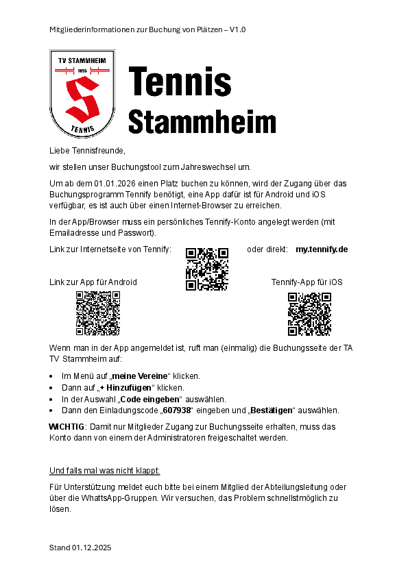auf dem Weg zur Digitalisierung und Modernisierung unserer Systeme werden wir ab dem 01.01.2026 mit der „Tennify“-App arbeiten, um die Vereinskommunikation, Platzbuchungen und weitere Themen wie Arbeitseinsätze für alle einfacher zu gestalten.