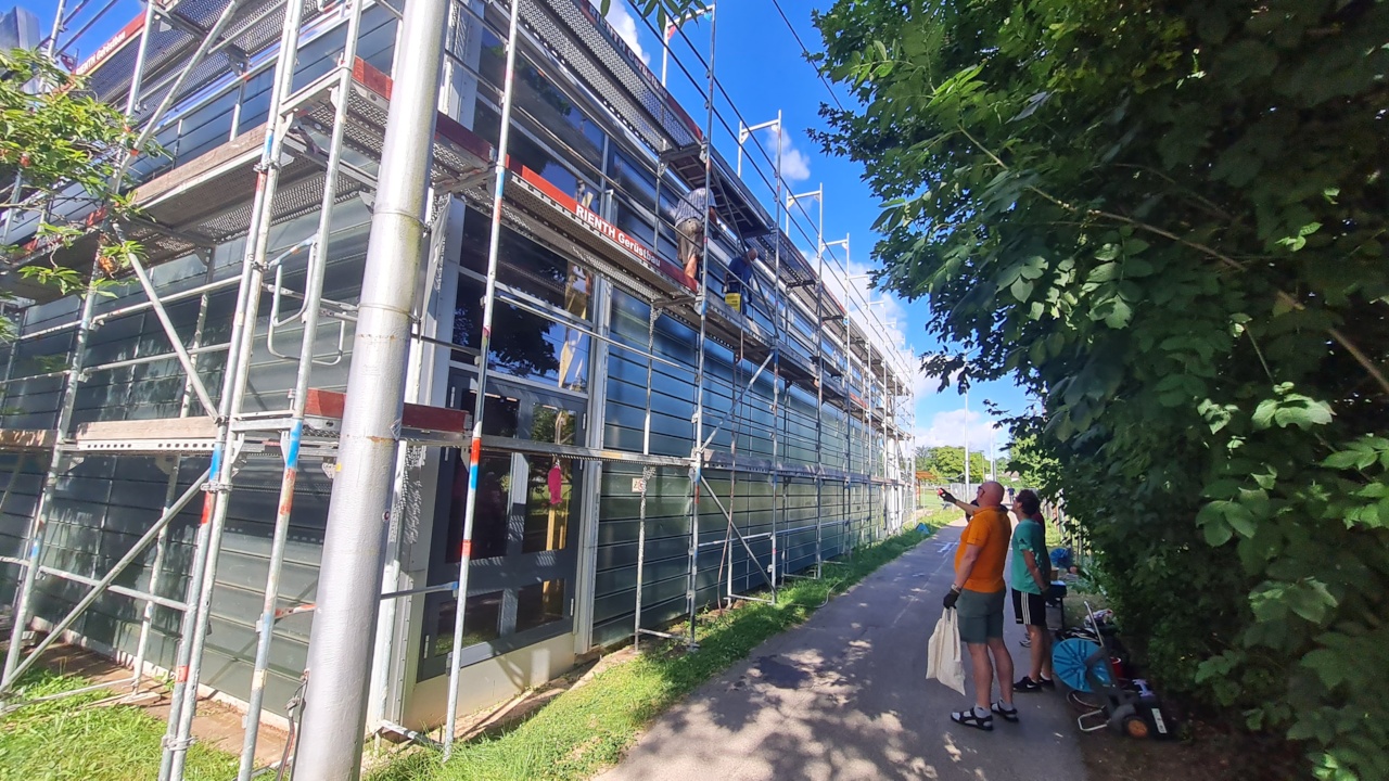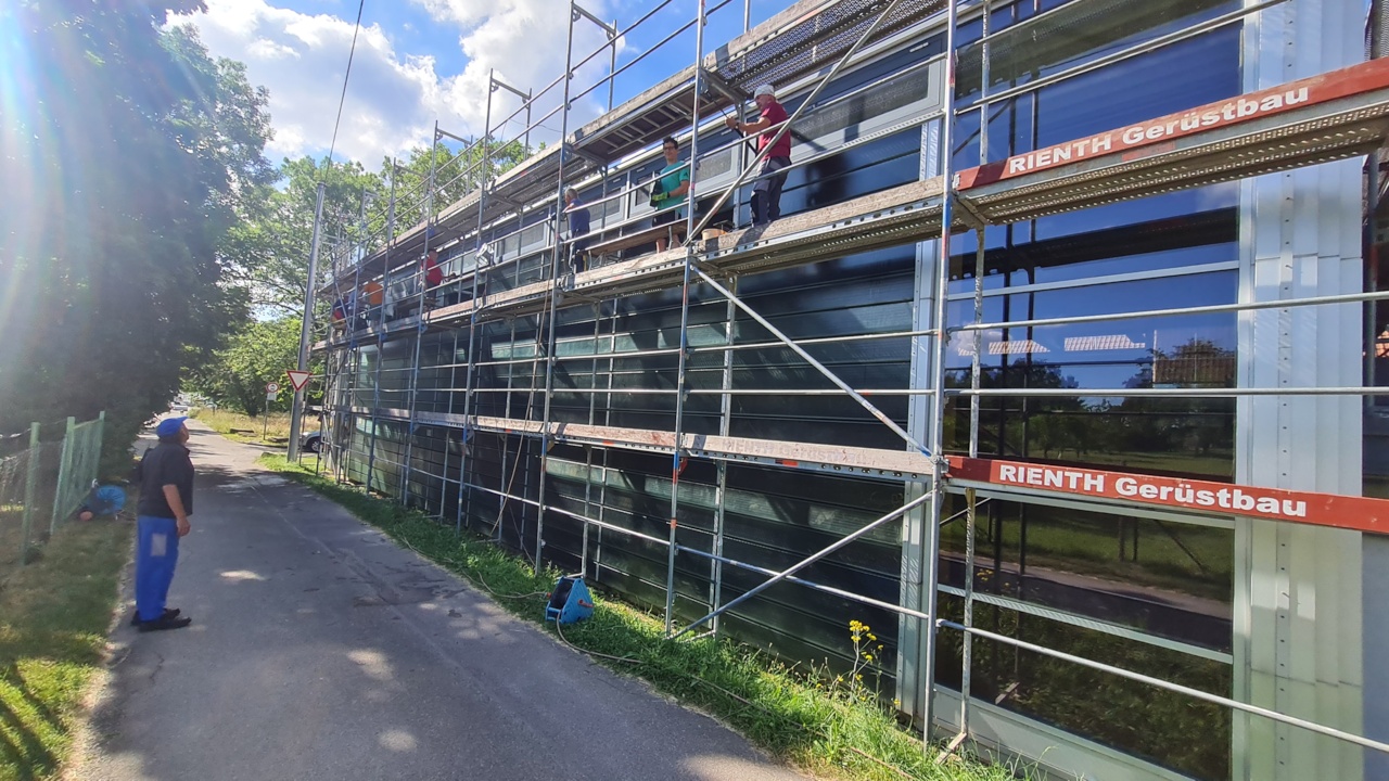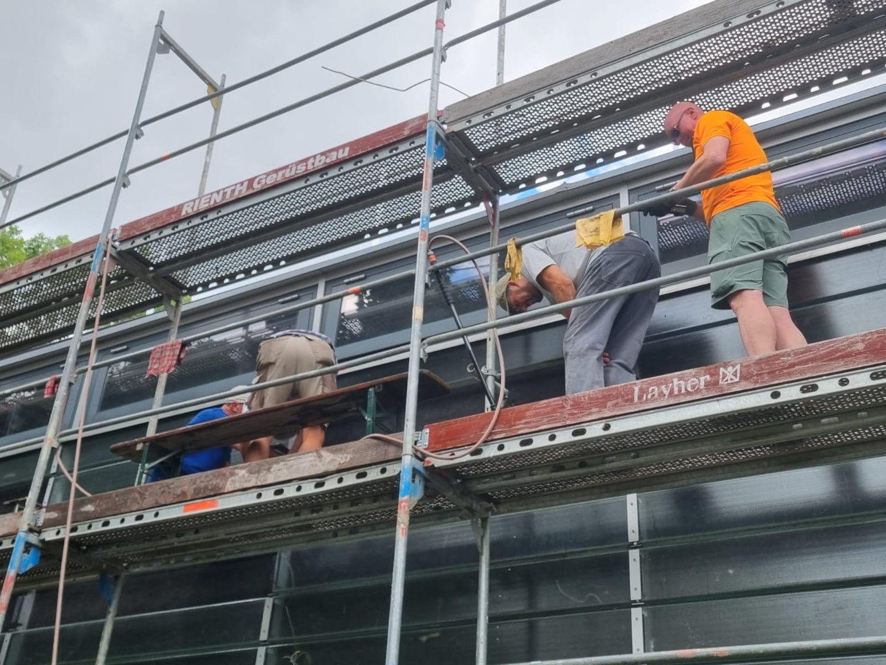 So wurde die eine Seite mit der größten Glasfassadenfront komplett gereinigt, indem jedes Glaselement abgenommen, gereinigt und wieder angebaut wurde. Nach nunmehr über 20 Jahren eine wichtige Grundreinigung, da sich zwischen Glaselementen und Dämmung teilweise Grünspan und Rankpflanzenbewuchs angesiedelt hatten. Die heißen Temperaturen taten ihr übriges und verlangten dem Helferteam einiges ab, die jedoch mit Dampstrahler und Wasserbürste bestückt regelmäßig etwas Abkühlung bei der Arbeit nutzen konnten. Ein großer Dank an alle, die an dem 7-Stunden-Arbeitseinsatz tatkräftig mitgeholfen haben.
