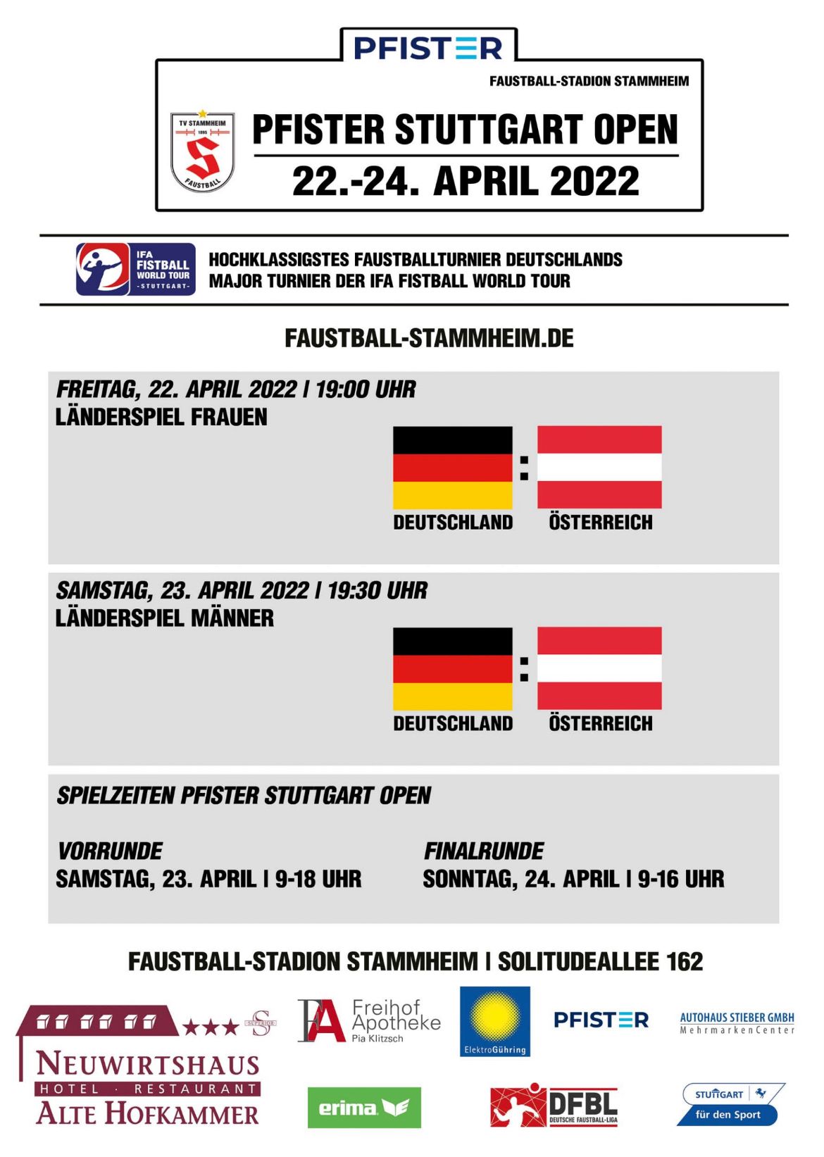 Den Auftakt macht in diesem Jahr erstmals bereits am Freitagabend ein Frauenländerspiel zwischen Deutschland und Österreich. Spielbeginn ist am 22.04. um 19.00 Uhr.