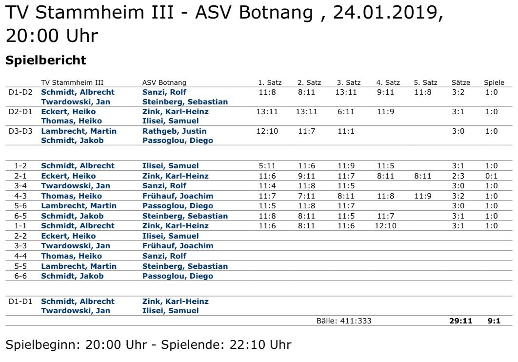 Am Donnerstag, den 24.01.2019 gastierte der ASV Botnang in der TV-Halle. Die aufstiegsambitionierte dritte Herrenmannschaft des TV Stammheim setzte sich nach 2 Stunden und 10 Minuten mit 9:1 durch und konnte somit einen gelungenen Einstand in das neue Tischtennisjahr 2019 feiern.