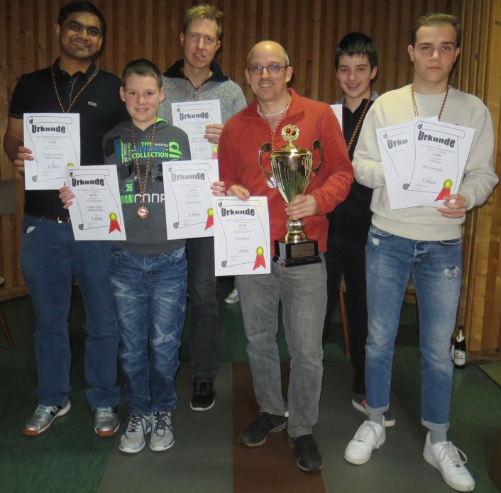 Von links auf dem Bild zu sehen sind: Prashant, Fabian, Heiko, Claus (Vereinsmeister Aktive), Tom sowie Jan (Vereinsmeister Jugend), die heute ihre Urkunden, Pokale und Medaillen in Empfang nehmen konnten.