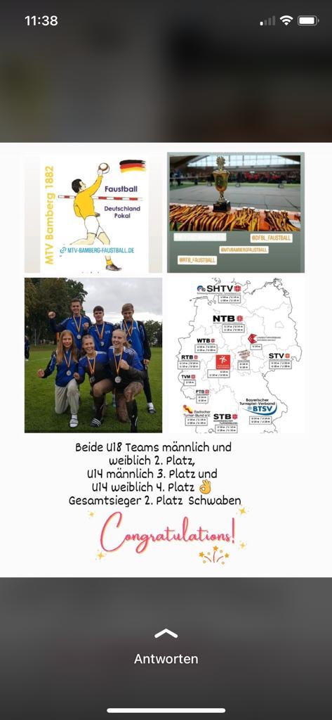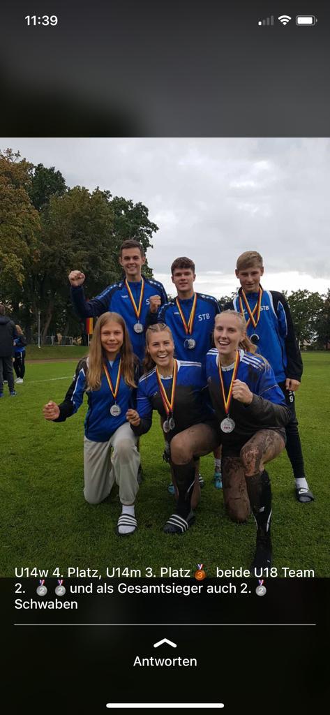 Am Wochenende in Bamberg konnten die 4 Schwäbischen Teams der U14 (m und w) sowie die U18 (m und w) am Samstag voll überzeugen und jeweils ihre Gruppen gewinnen. Am Sonntag kam etwas Sand ins Getriebe und so landete die U14 w mit Stella Dörr auf Rang 4, die U14 m mit Luca Gorcenko auf dem Bronze Rang. Besser machten es die Großen: Larissa Keser und Carla Gorcenko unterlagen, wie die Jungs mit Tom Aigner und dem stark aufspielenden Tobias Beck erst im Finale.